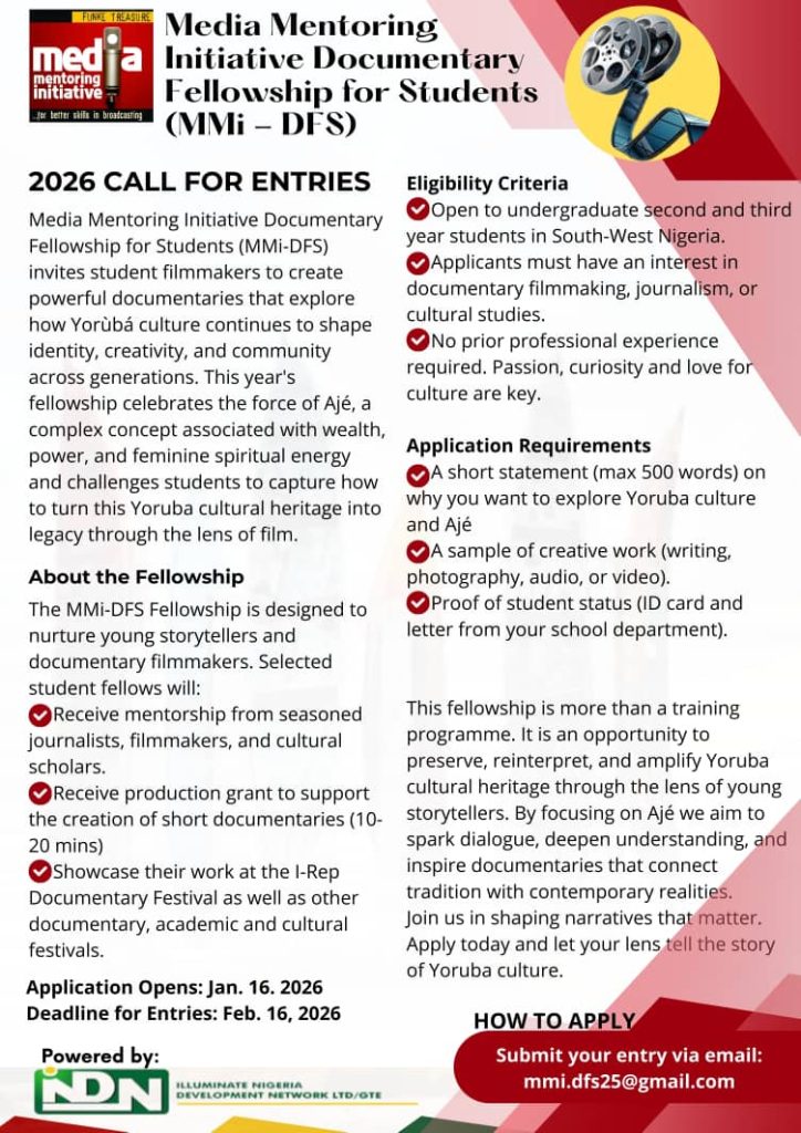 The Media Mentoring Initiative Documentary Fellowship for Students (MMi-DFS) has opened applications for its second cohort, calling on undergraduate students across South-West Nigeria to take part in a cultural storytelling programme focused on Ajé in Yoruba cosmology.