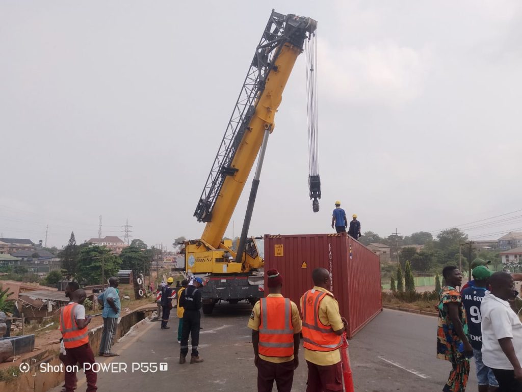 The accident occurred at about 6:00 a.m. when the truck rolled backward and fell, leaving the container overturned and obstructing roughly 75% of the road, according to the Lagos State Emergency Management Agency (LASEMA).